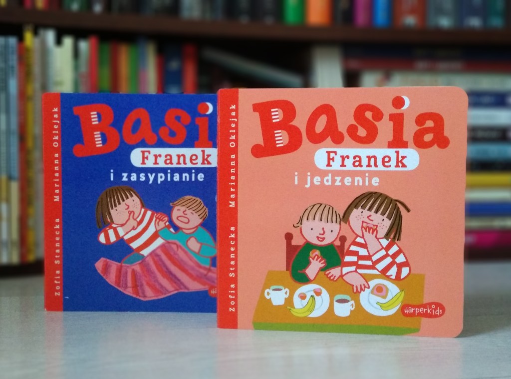 Basia, Franek i jedzenie to książka, która w krótkich, prostych zdaniach opowiada o posiłkach spożywanych przez Franka w ciągu całego dnia. Zaczynamy więc od śniadania złożonego z pokrojonej na małe kawałki kanapki, które chłopiec z radością wrzuca do kubka, tworząc z nich stateczki pływające w kakaowym jeziorku. Jest i banan na drugie śniadanie, obiadowa marchewka, makaron z sosem na kolację oraz podwieczorek przygotowany wspólnie z Basią dla ich przytulanek. Basia, Franek i zasypianie opowiada zaś o wcale niełatwym wieczornym rytuale, kiedy nadchodzi już godzina snu, a najmłodszy członek rodziny wcale spać nie chce. Tu z pomocą przychodzi starsza siostra, która metodą prób i błędów sprawia, że Franek przestaje się złościć, a zaczyna uśmiechać i wreszcie z tymże uśmiechem na ustach zasypia.