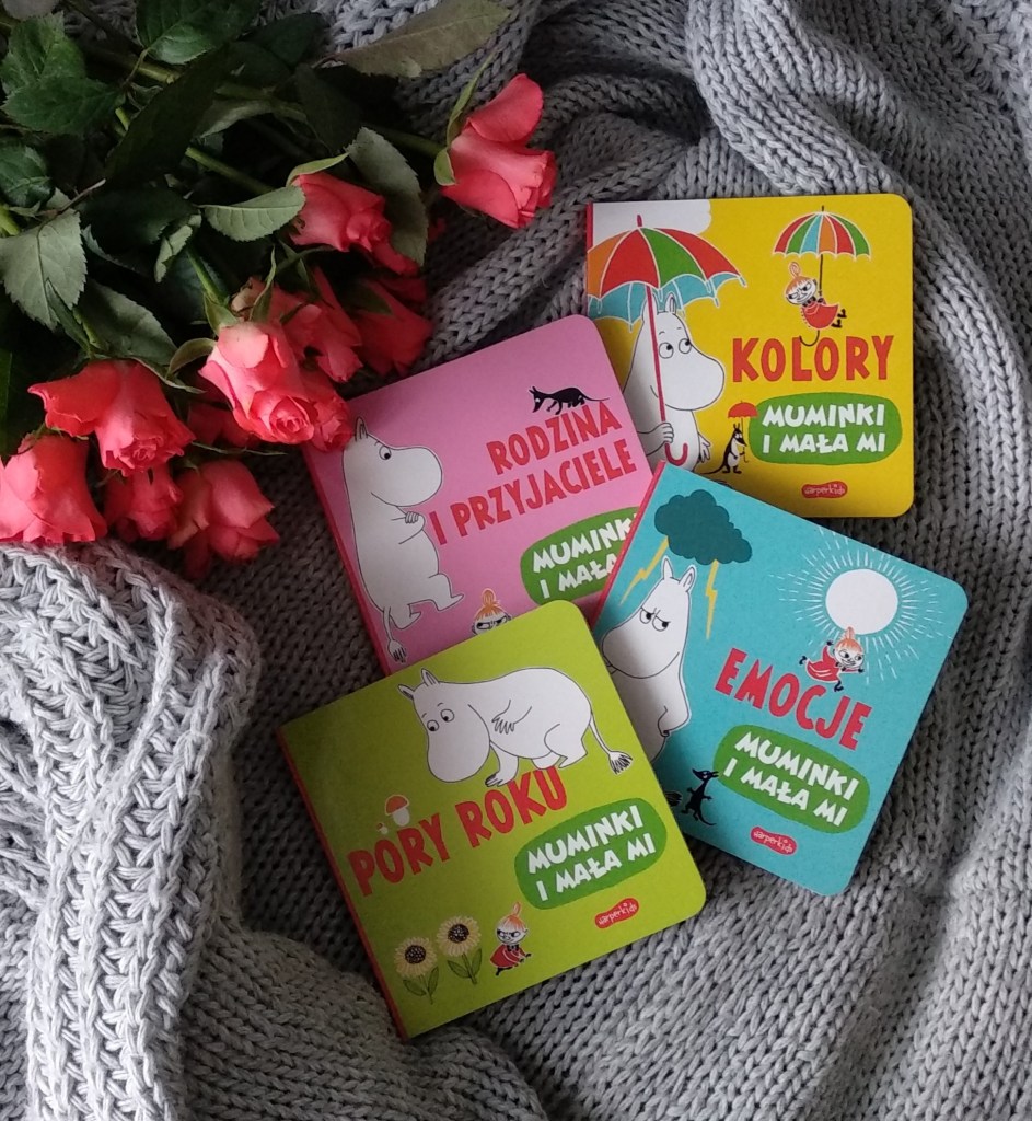 Tekstu w każdej z książeczek nie ma zbyt wiele, dosłownie zdanie lub dwa na każdej z rozkładówek. I tak w przypadku Pór roku śledzimy, co się podczas każdej z nich dzieje: wiosną za sprawą ciepłych promieni słońca topnieją śniegi, latem mieszkańcy Doliny Muminków cieszą się słoneczna pogodą i oddają pracy w ogródku, jesienią Włóczykij wraz z wędrownymi ptakami wyruszają na południe, a zimą cała rodzina Muminków zapada w zimowy sen. Część o kolorach pozwoli maluszkom zapoznać się z podstawowymi barwami, ale też pomoże w odróżnieniu kolorów jaśniejszych i ciemniejszych, bo chociażby trawa i drzewa mają kolor zielony, ale już namiot Włóczykija jest jasnozielony, dom Muminków jest niebieski, natomiast balonik trzymany przez Małą Mi ma odcień jasnoniebieski. Rodzina i przyjaciele to książeczka, która przybliży najmłodszym bohaterów stworzonych przez Tove Jansson, a przy okazji pokaże jakie relacje ich łączą: Tatuś i Mamusia Muminka to jego rodzice, Mimbla jest starszą siostrą Małej Mi, a Włóczykij ich krewnym oraz najlepszym przyjacielem Muminka. W serii znalazła się także książeczka o emocjach, które zapoznaje najmłodszych z różnymi nastrojami, takimi jak smutek, radość, znudzenie czy spokój, ale do niej akurat nie do końca jestem przekonana – raz, że bycie psotnym, odważnym czy ciekawskim to dla mnie bardziej cechy charakteru niż emocje, a dwa, że poza krótkim zdaniem określającym każdego z bohaterów nie bardzo wiemy z czego jego samopoczucie czy cechą szczególna wynika.