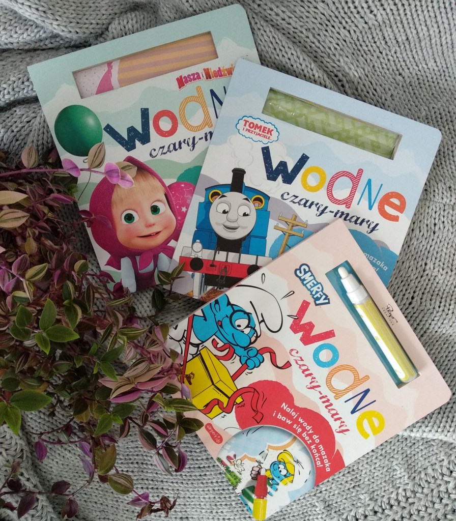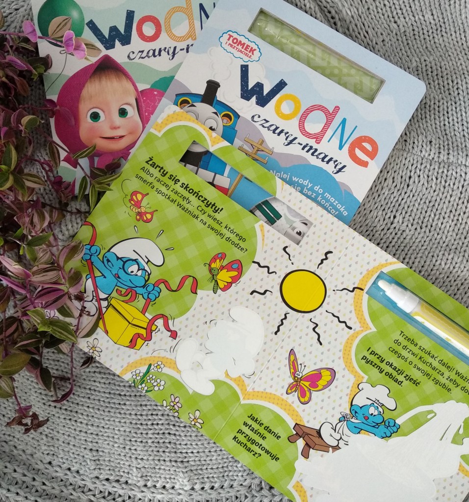 I choć wodnych kolorowanek mamy w swoich zbiorach całe mnóstwo, to nie powtrzymało mnie to przed tym, by tę naszą kolekcję uzupełnić o kolejne trzy książeczki, tym bardziej, że za bohaterów mamy tu postacie doskonale moim dzieciom już znane – Smerfy, Tomka oraz Maszę. Poza tym to naprawdę jedna z tych rzeczy, które można włożyć do koszyka przy okazji i bez absolutnie żadnych wyrzutów sumienia, wiedząc doskonale, że przyniesie mnóstwo radości, a przy tym na ogół nie kosztuje zbyt wiele (na moje oko średnio tyle ile trzy zwykłe kolorowanki, a moim zdaniem zapewniają jednak więcej frajdy).