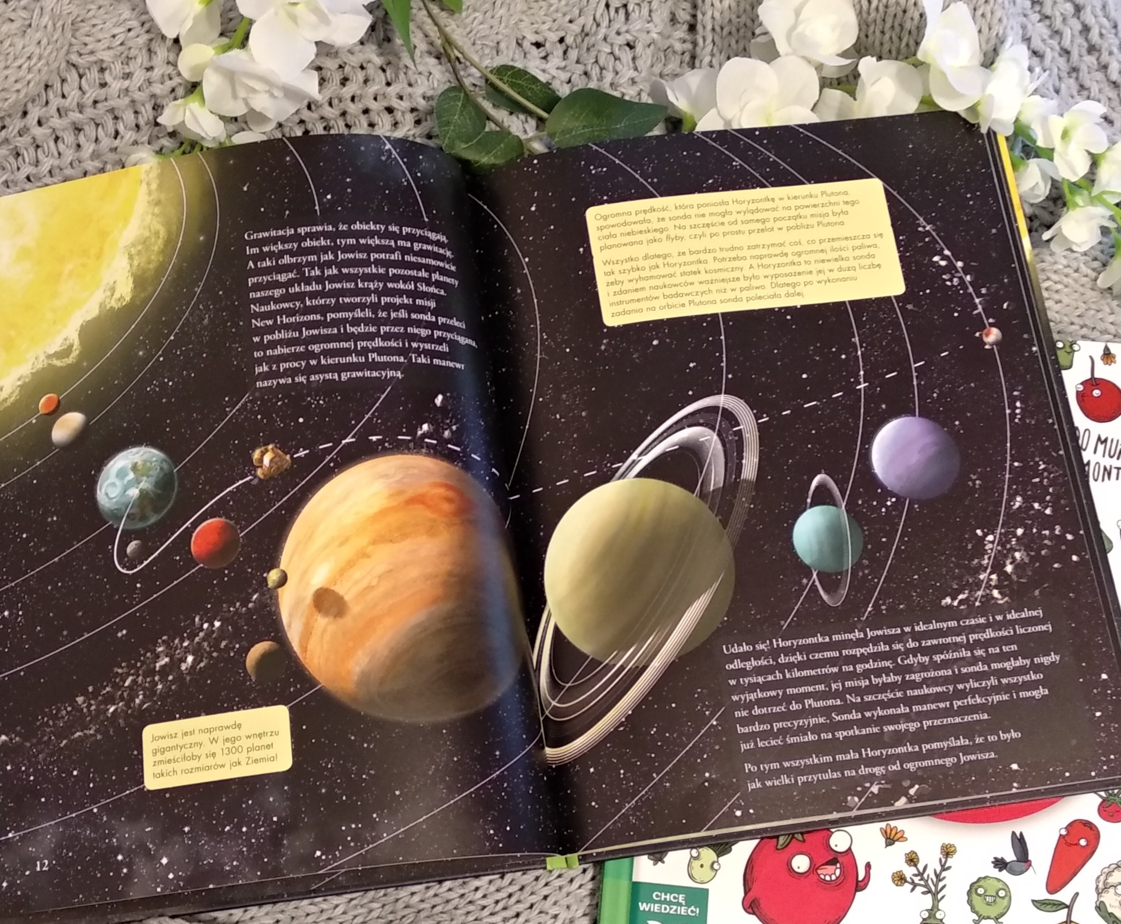 Wielka misja małej sondy to przedstawiona w prosty, często zabawny i bardzo przystępny dla najmłodszych czytelników sposób historia sondy New Horizons, która w 2006 roku przy pomocy rakiety nośnej Atlas V551 została wystrzelona w kosmos w celu dotarcia do najbardziej oddalonej od Słońca planety (która zresztą już w trakcie trwania misji przestała nią być) – Plutona. Trwająca dziesięć lat podróż była męcząca i niebezpieczna, ale naukowcy, którzy ją stworzyli dołożyli wszelkich starań, by na te wszystkie niebezpieczeństwa ją przygotować. Myślę, że dla fanów kosmicznej tematyki (a mam wrażenie, że większość dzieci w którymś momencie przechodzi prawdziwą fascynację tym tematem) to będzie fantastyczna propozycja – mały czytelnik prześledzi etapy podróży Horyzontki (a podróż ta wcale nie kończy się na Plutonie) i z całkiem bliska przyjrzy się Plutonowi, zwłaszcza, że poza dość szczegółowymi opisami tego, co mała sonda widziała i czego doświadczyła, w książce znalazły się też zdjęcia przez nią wykonane.